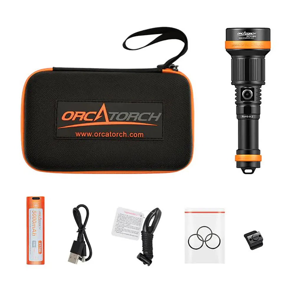 ZD710MK2 divelight 1x 21700 USB-Type C battery, lanyard, 1x charging cable, spare O-rings, zipper carrying bag.